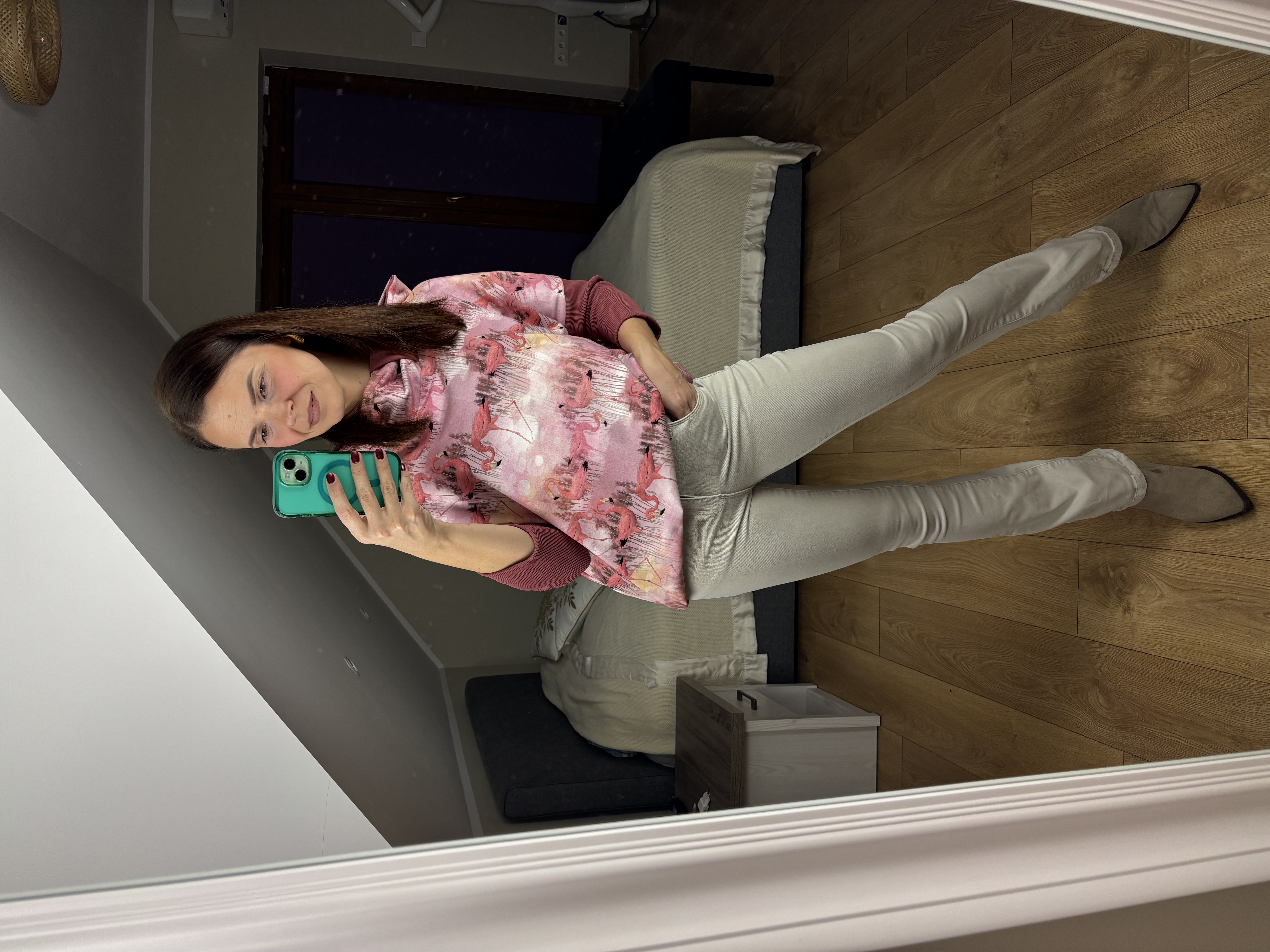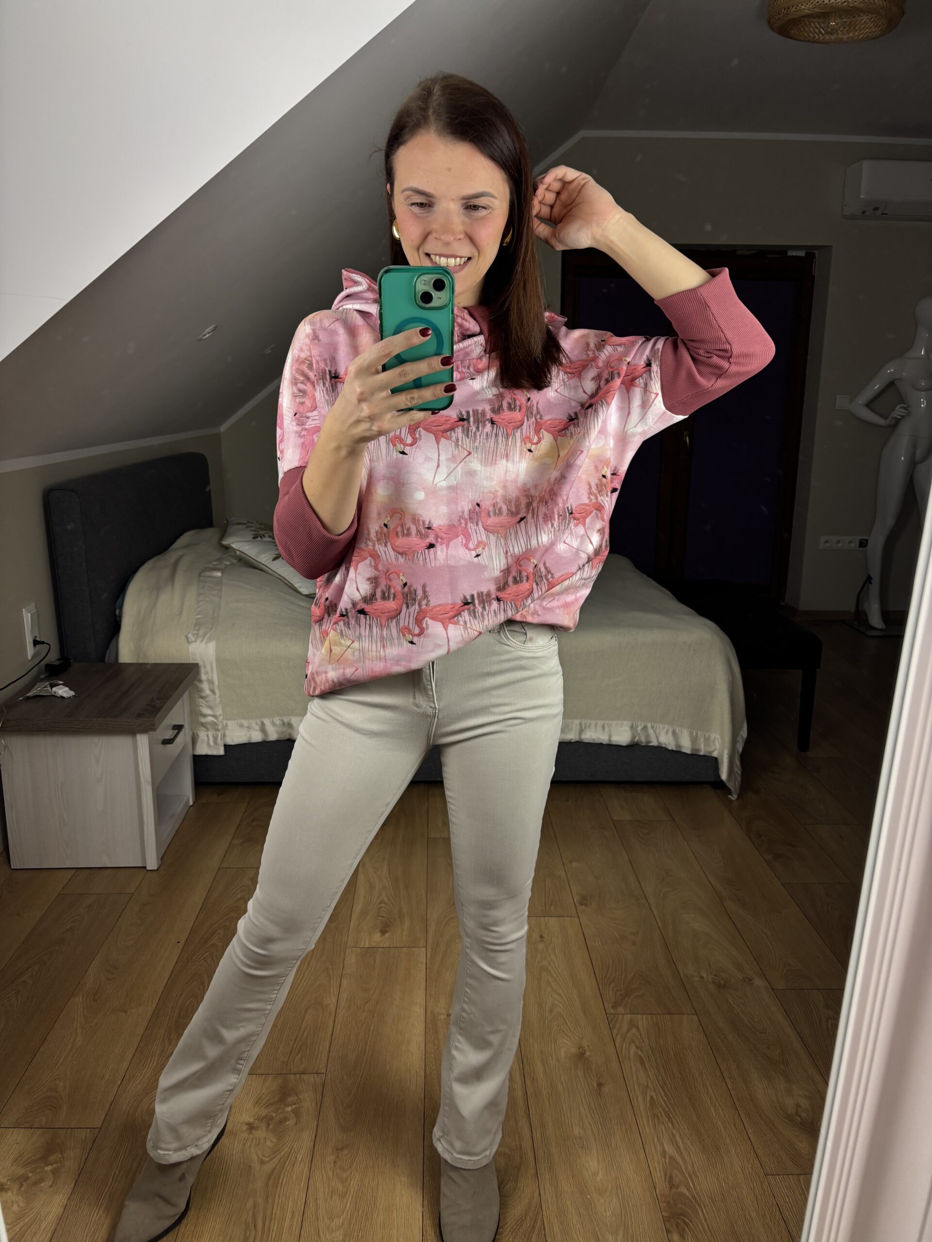 Bluza oversize z obszernym kapturem z kołnierzem i oryginalnym printem flamingów. Komfortowy fason w rozmiarze UNI. Idealna na co dzień – wygodna, stylowa i przyciągająca wzrok.