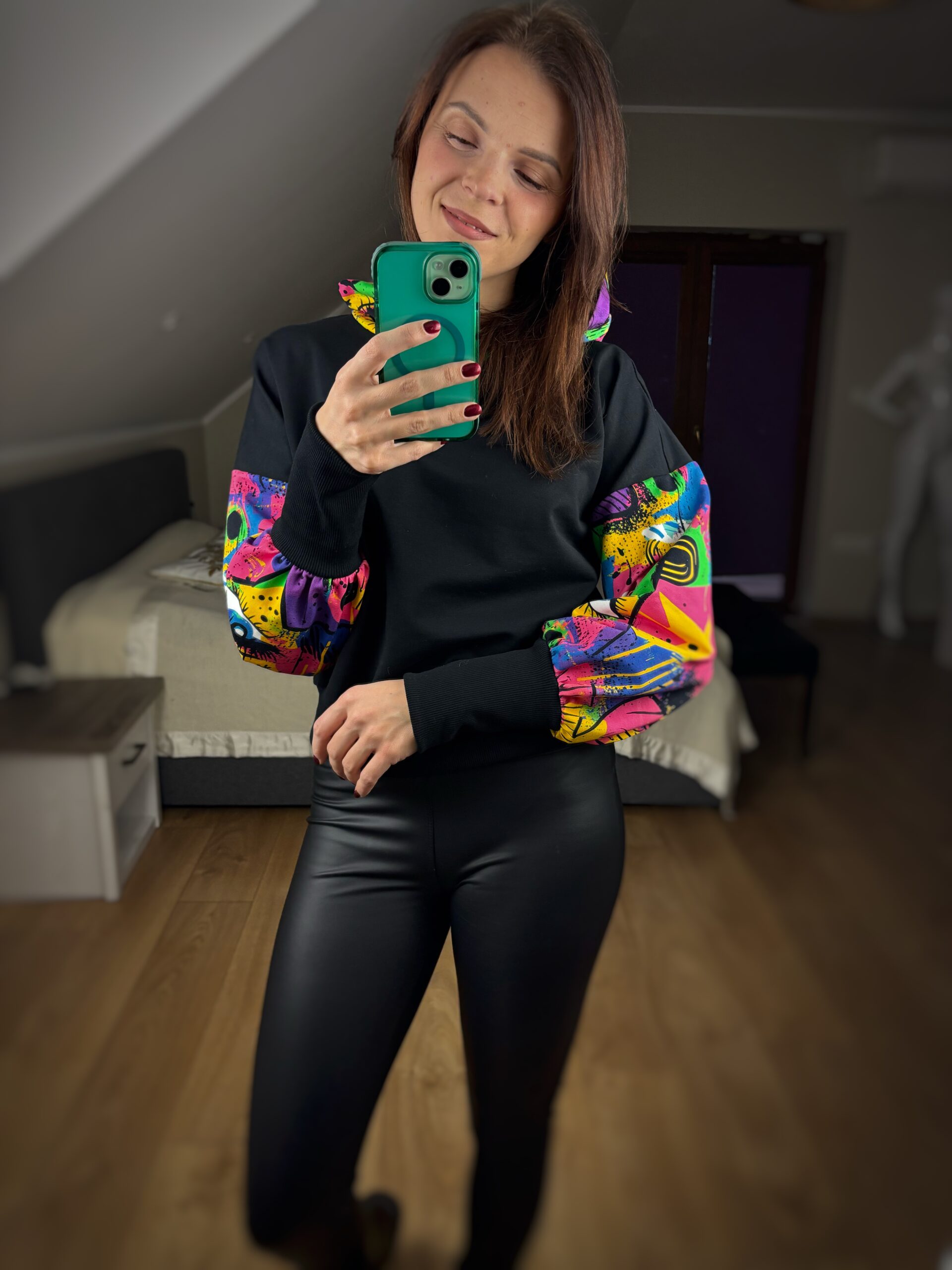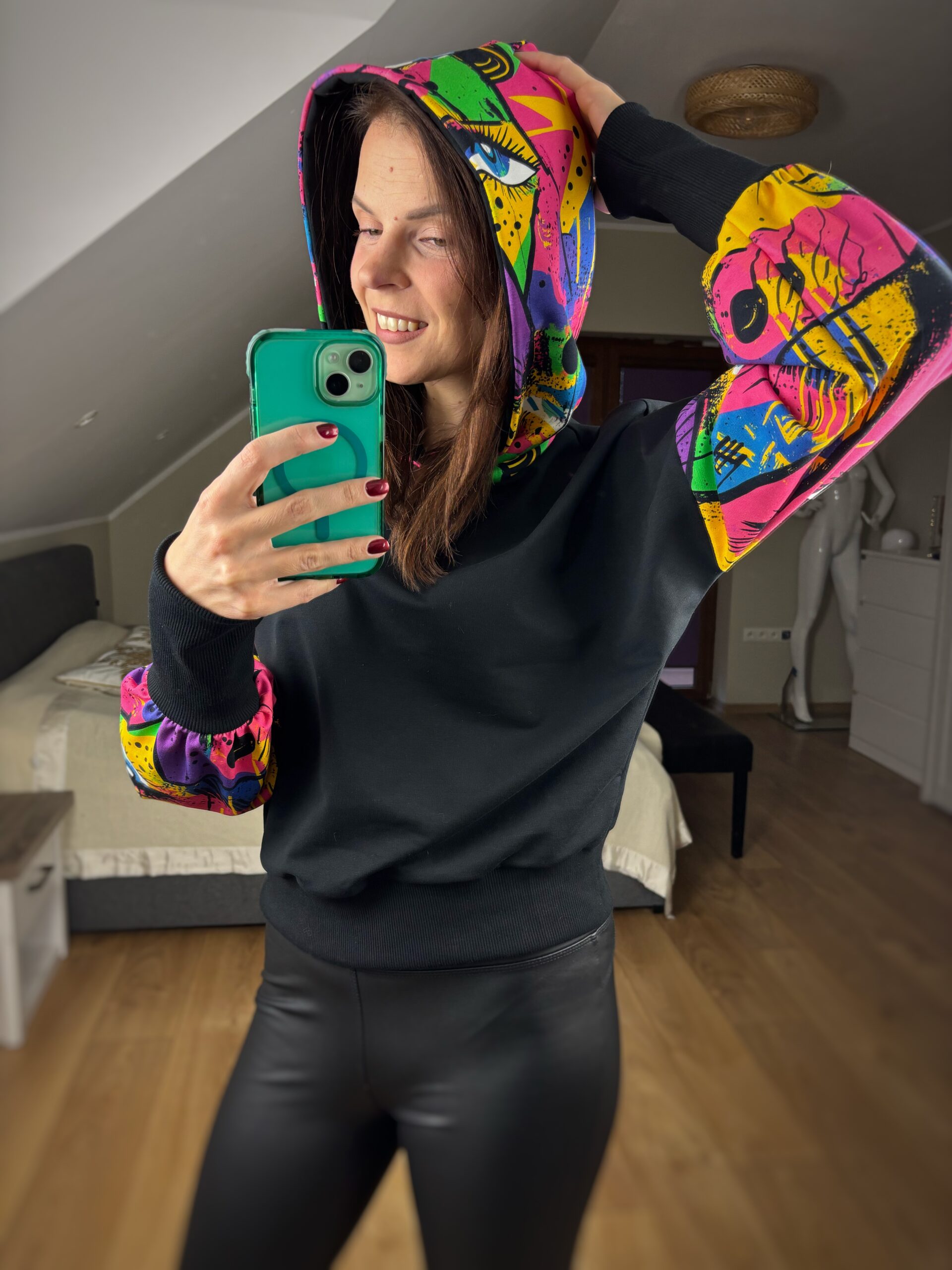 Bluza MILA z kapturem i efektownym, bufiastym rękawem. Kolorowy print, krótki fason i wygodny krój. Rozmiar UNI – stylowa i komfortowa na co dzień.
