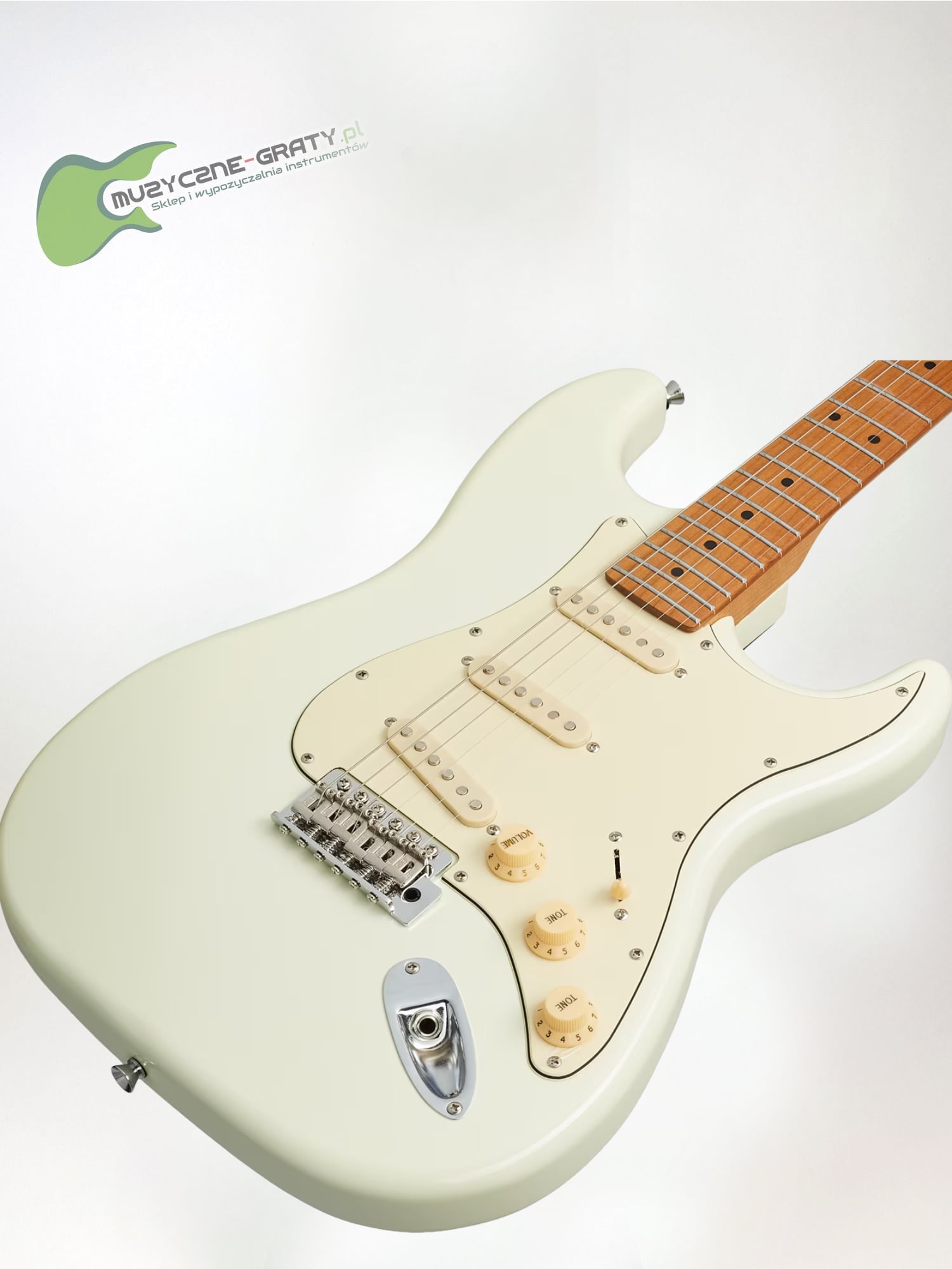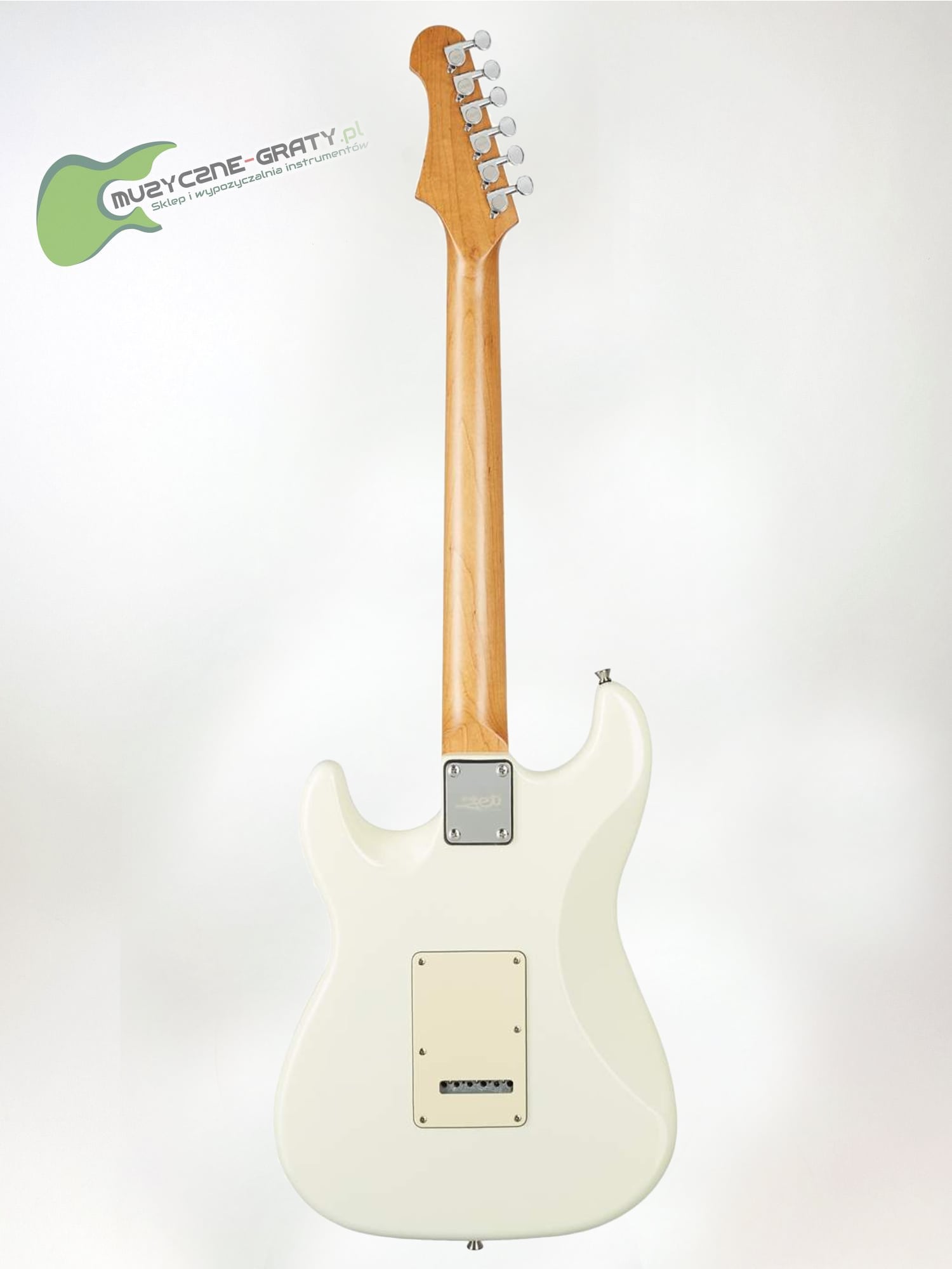 Jet JS-300 to gitara elektryczna w stylu ST, łącząca klasyczne brzmienie z przystępną ceną. Wyposażona w trzy przetworniki single-coil, pięciopozycyjny przełącznik oraz regulację głośności i barwy, oferuje szeroką paletę dźwięków. Korpus z lipy i klonowy gryf nadają jej zbalansowany ton z wyrazistym środkiem i jasną górą. Stabilność i komfort gry zapewnia skręcana, termicznie obrabiana szyjka, chromowane klucze i tremolo. To solidny wybór dla początkujących i średniozaawansowanych gitarzystów, którzy szukają instrumentu na lata.