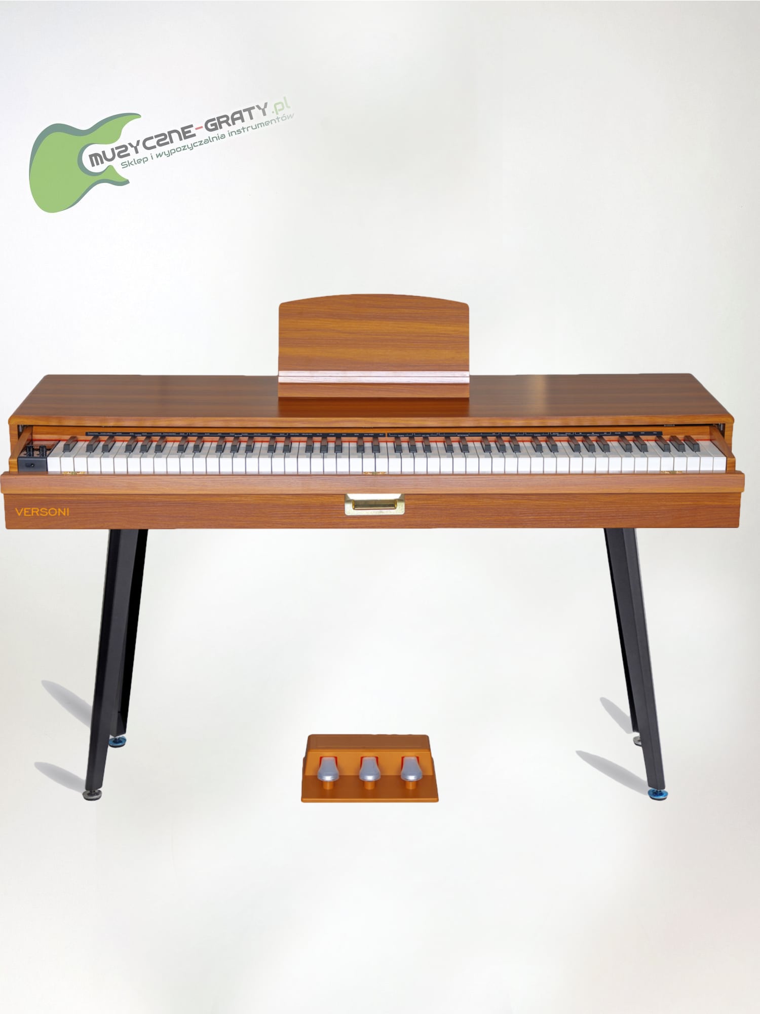 Odkryj wyjątkowe pianino cyfrowe VERSONI, które mistrzowsko łączy niepowtarzalnymi design w stylu mid-century z autentycznym doświadczeniem gry na instrumencie klasy premium. Jego stylowa, wykończona w odcieniu ciepłego orzechowego drewna obudowa kryje w sobie zaawansowany moduł brzmieniowy z bankiem brzmień instrumentów zarejestrowanych w legendarnym europejskim studiu nagraniowym.